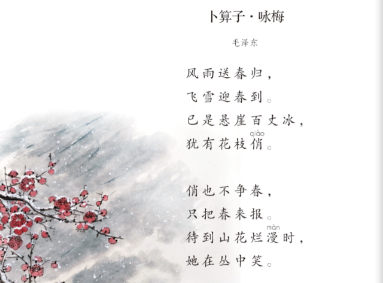 《卜算子·咏梅》收录在四年级(下册)语文课本中。这首诗写于1961年12月。当时,以美国为首的西方国家一直对华实行经济封锁。而苏联又背信弃义,撕毁合同,停止援助,撤走专家。加上我国遭遇三年严重困难,面临着前所未有的严峻考验。毛泽东在广州筹备扩大的中央工作会议期间,读了陆游的《卜算子·咏梅》,感到文辞好,但意志消沉,只可借其形,不可用其义,于是他再续一首与陆游风格不同的咏梅词,此词塑造了梅花俊美而坚韧不拔的形象,鼓励人们要有威武不屈的精神和革命到底的乐观主义精神。