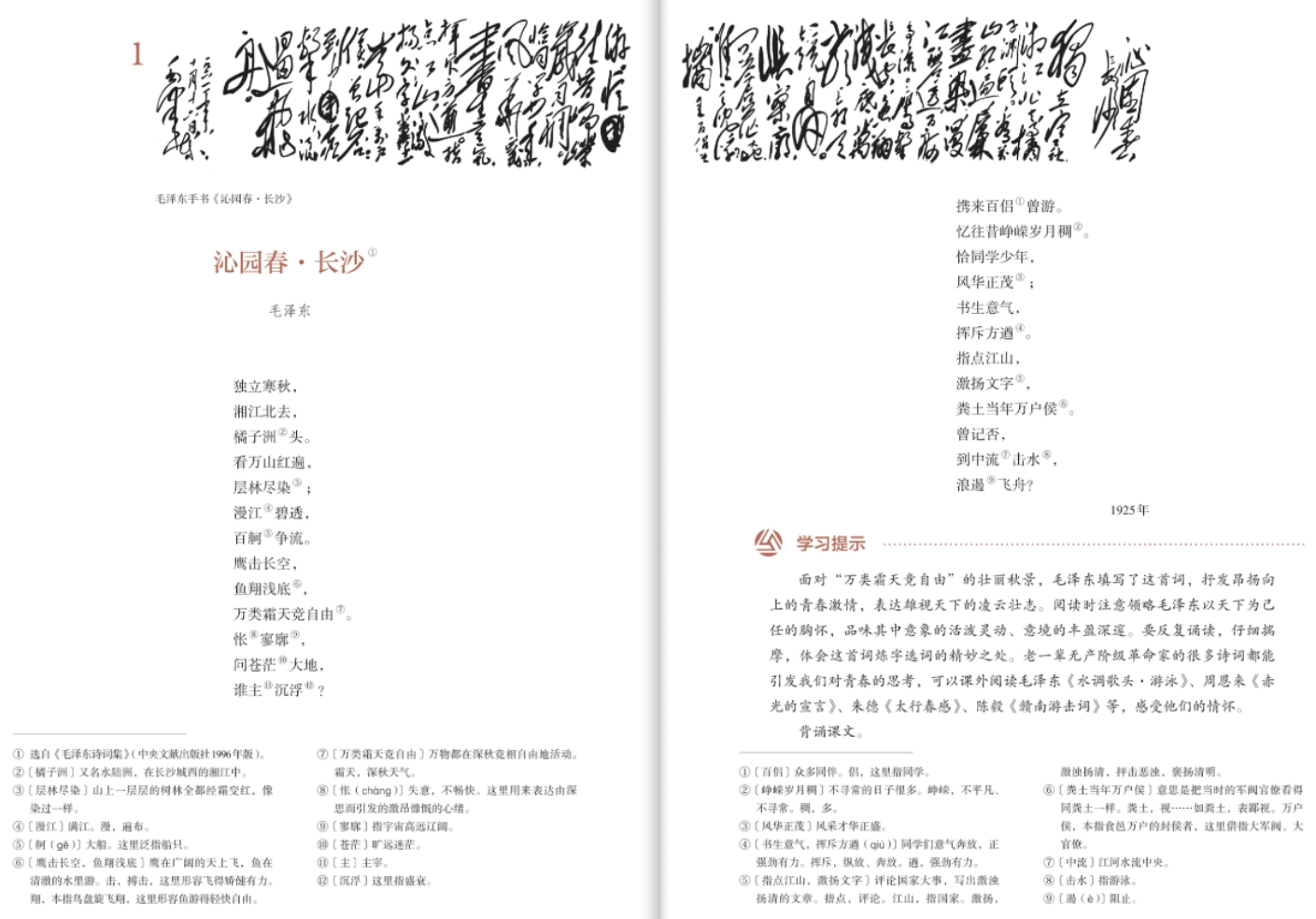 《沁园春·长沙》收录在高中语文必修课(上册)中。1925年秋,32岁的毛泽东写下了《沁园春·长沙》:“恰同学少年,风华正茂;书生意气,挥斥方遒。”通过对壮丽、辽阔的长沙秋景的描绘和对少年时代峥嵘岁月的回忆,抒发了以天下为己任的远大志向。这首诗词是经毛泽东自己认定的诗词创作的正式起点,堪称是青年毛泽东的精品力作。