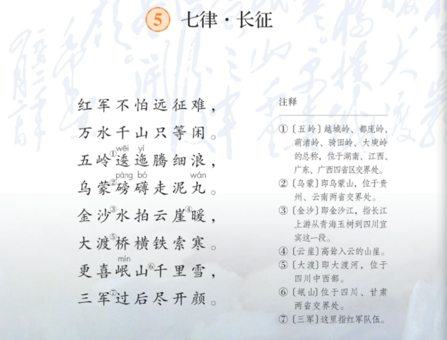 人教版六年级(上册)语文课本中的《七律·长征》。
