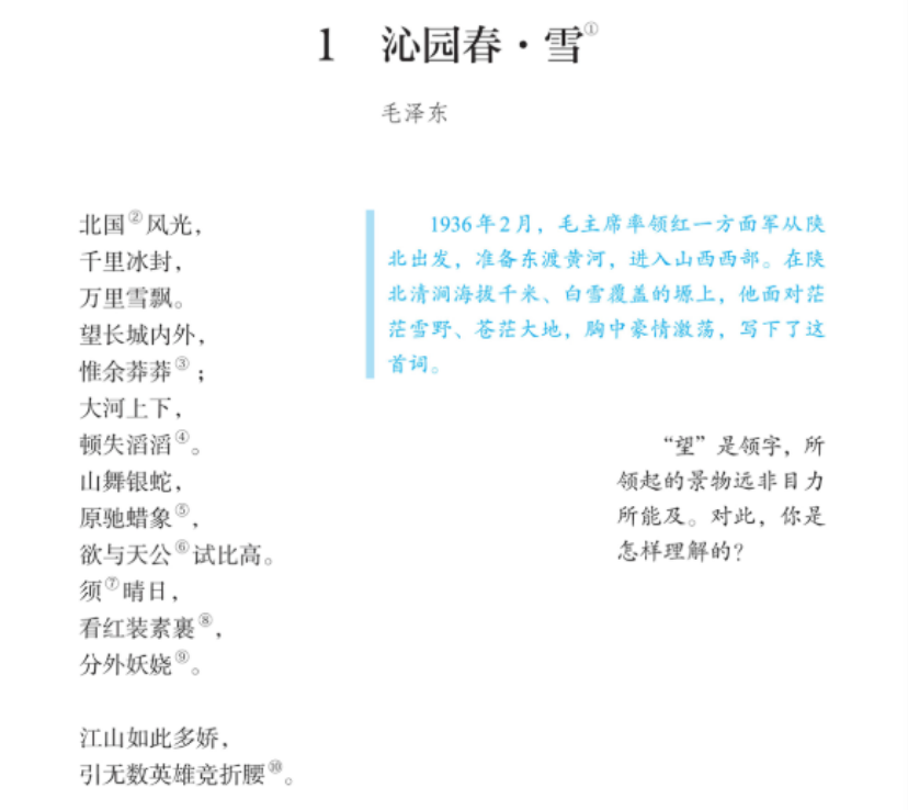 人教版九年级(上册)语文课本中《沁园春·雪》。