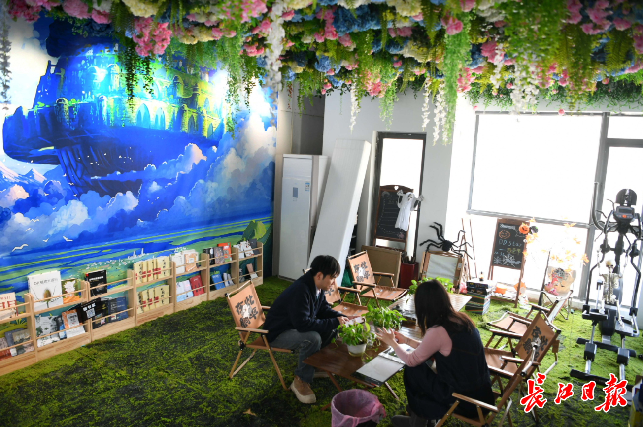 公司茶水间装饰成户外露营休闲区,有图书、健身器和饮料让员工享用。 记者高勇 摄