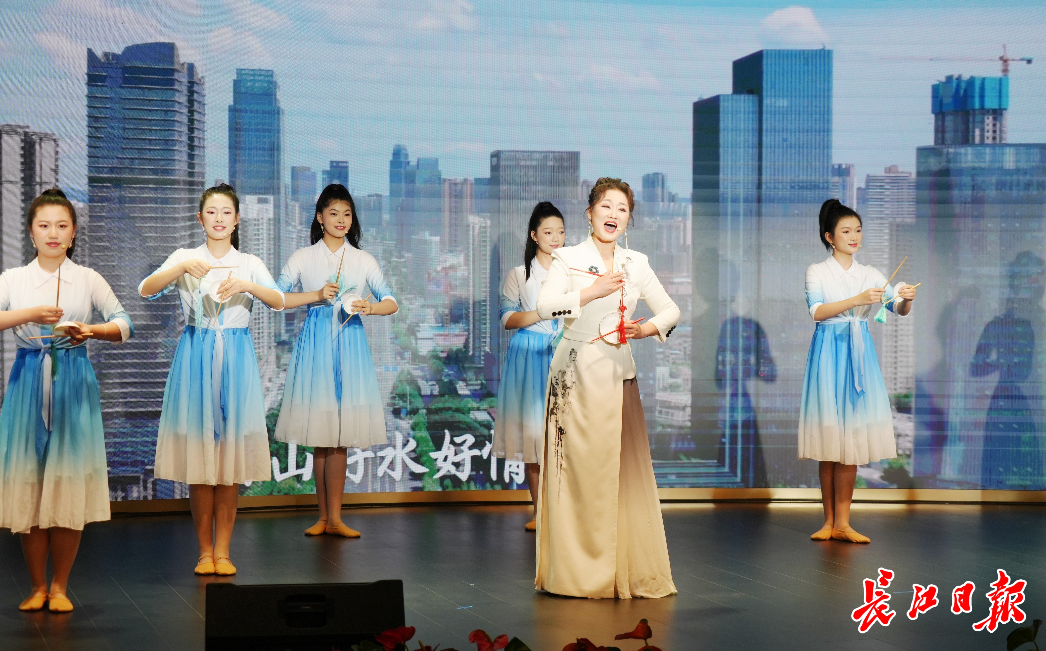 湖北小曲国家级非物质文化遗产代表性传承人、武汉说唱团演员姚俐玲和武汉市艺术学校的孩子们,带来曲艺联唱《欢迎你到武汉来》,将本土特色曲种和流行说唱结合,展示了武汉的美景和人文历史,也将武汉曲艺人“喜迎天下客”的热情和胸怀展现得淋漓尽致。歌舞《长江汉江》的创作灵感来源于两江交汇形成的“人”字形 图案,描绘了长江和汉江握手拥抱,共同创造出一座大都市的辉煌。具有武汉特色的文化演出,引来嘉宾们掌声不断。