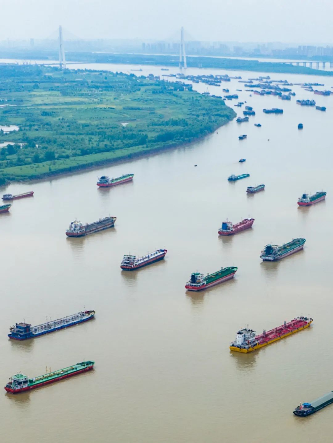 船舶在阳逻港区水域行驶(无人机照片)。新华社记者杜子璇 摄