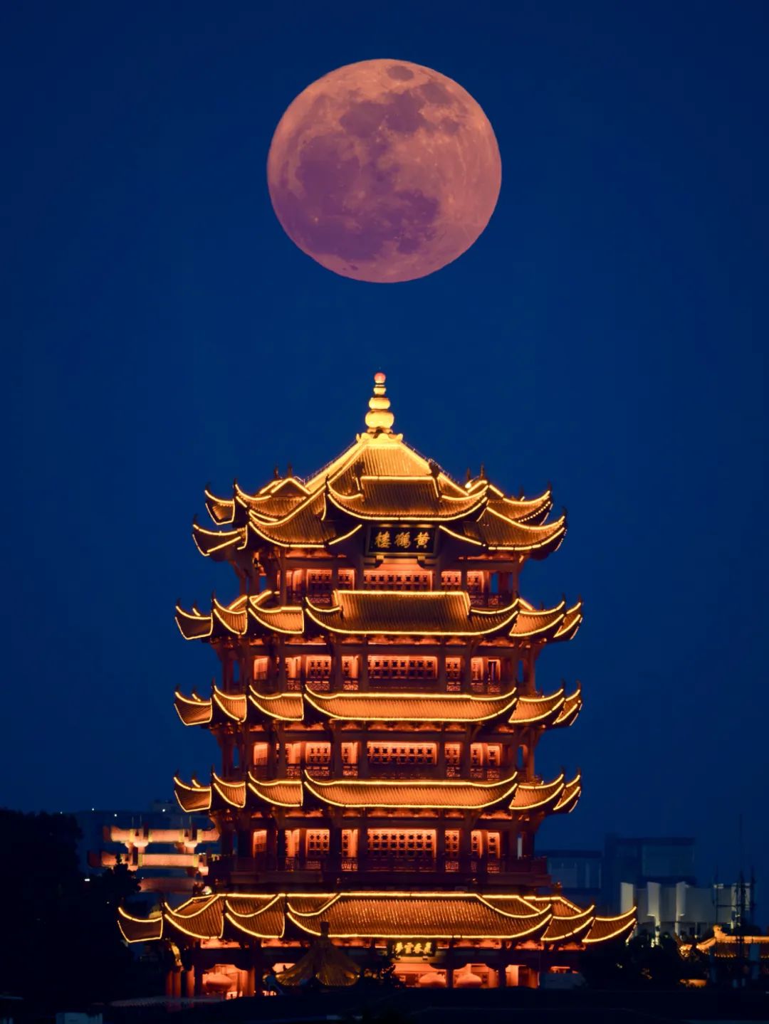 一轮圆月在黄鹤楼上空升起。新华社记者胡竞文 摄