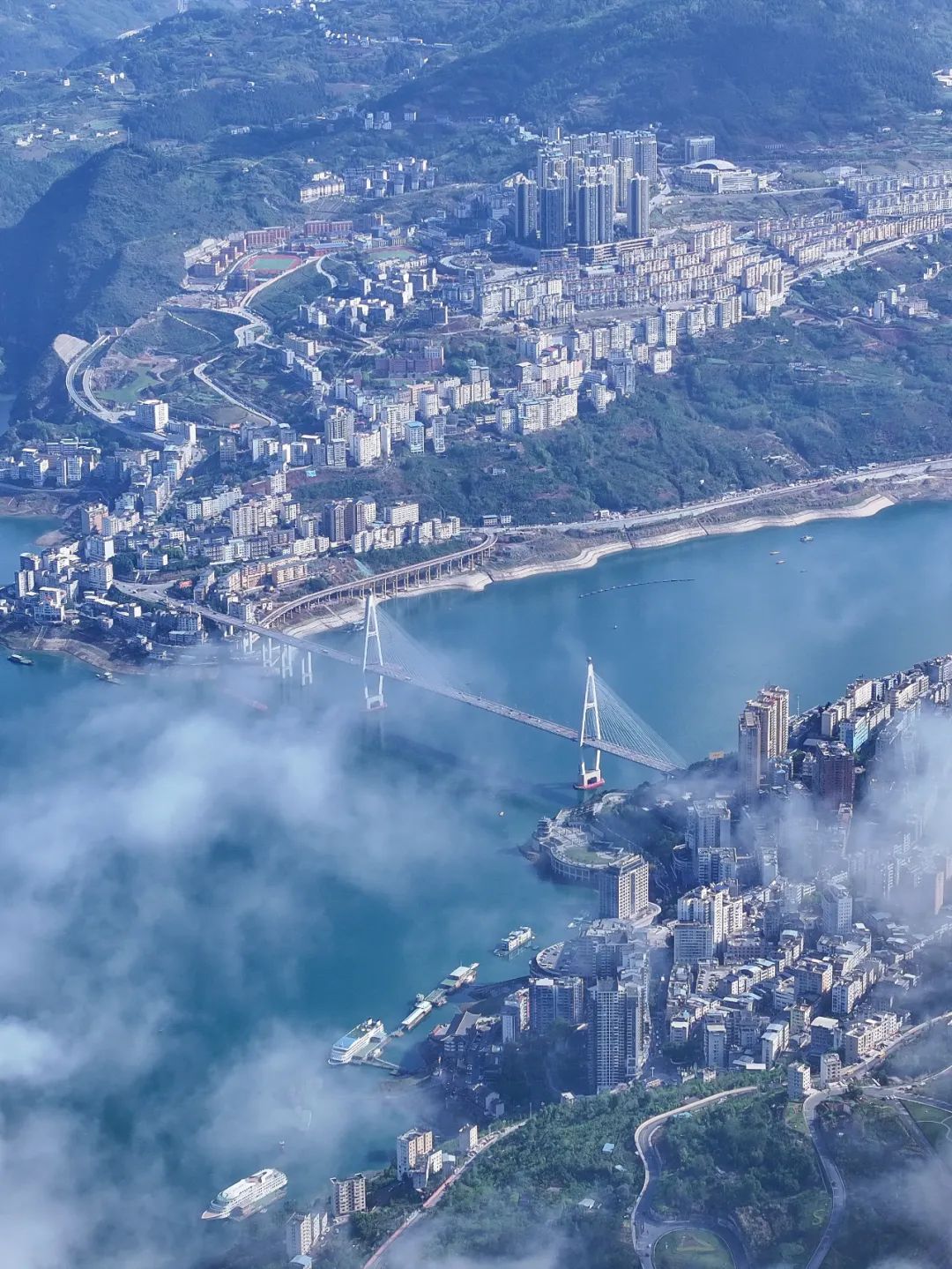 在湖北省巴东县巫峡口景区拍摄的巴东长江大桥景色(无人机照片)。新华社发(赵军 摄)