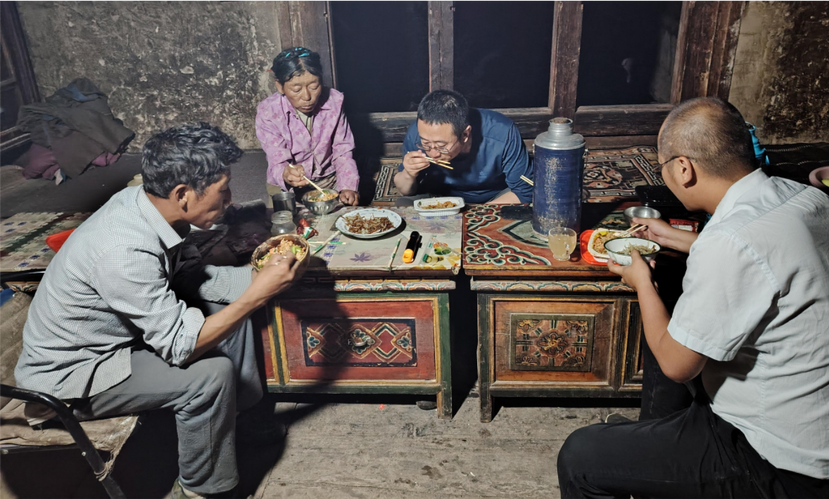 项目建设者在勘察工程线路过程中与当地村民共进晚餐。 通讯员潘卫 摄