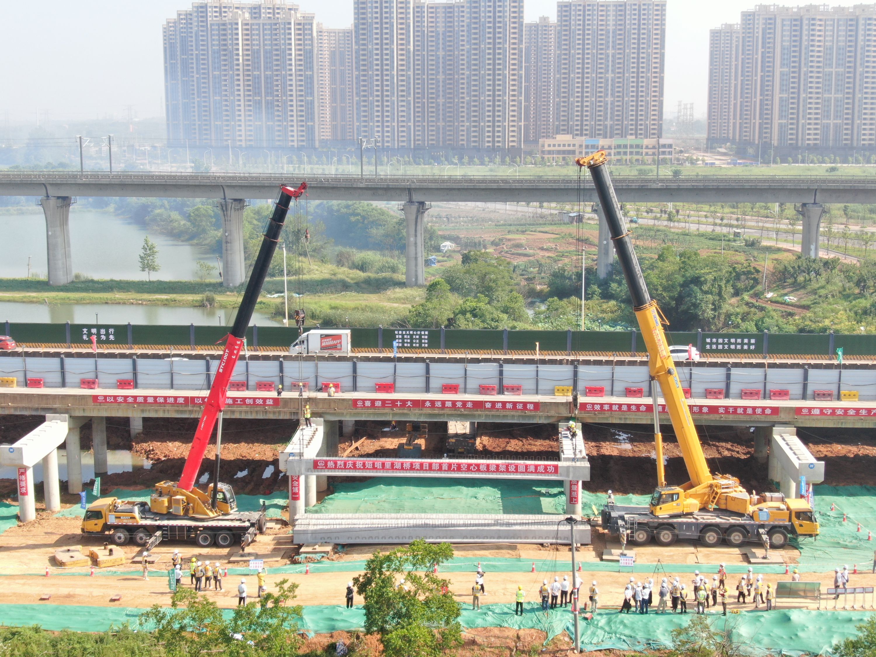 短咀里湖桥改造工程首片梁正在吊装中。(通讯员余娅娟供图)