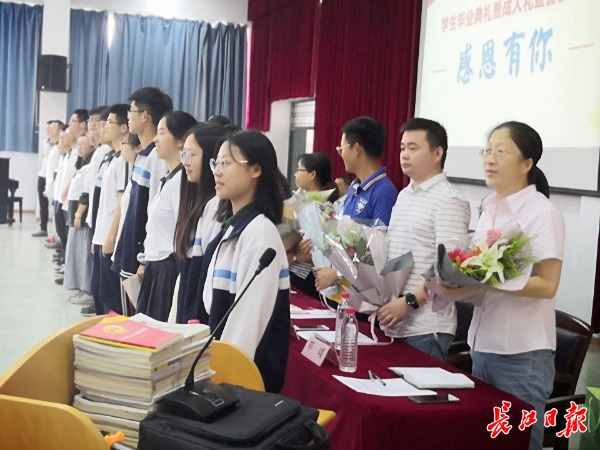 长江日报记者在现场看到,该校500余名高三毕业生集体宣誓,参加了一场庄严的成人仪式,18名高三班主任全程面带微笑,陪伴学生共度离校前的最后一天。