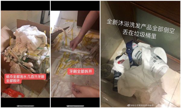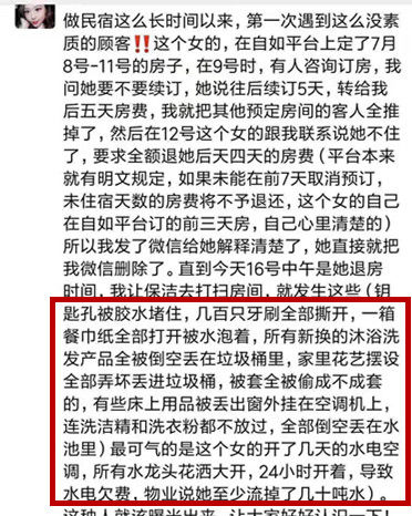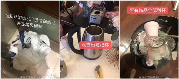 根据房东陈阳的陈述,7月16日中午,王可退房后,保洁工进入房间打扫看到了惊人一幕。“钥匙孔被胶水堵住,几百只牙刷全部撕开,一箱餐巾纸全部被水泡,所有新换的沐浴洗液产品全部被倒空丢进垃圾桶……”