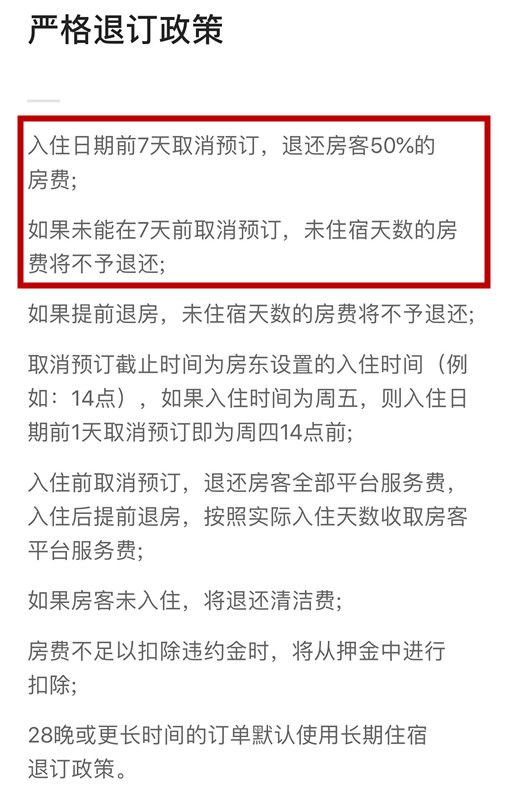 针对双方争议点,荔枝新闻随后先检索了两人交易的民宿平台,发现退订政策里确实有明确规定:“入住日期前7天取消预定,退还房客50%的房费;如果未能在7天前取消,未住宿天数的房费将不予退还。”