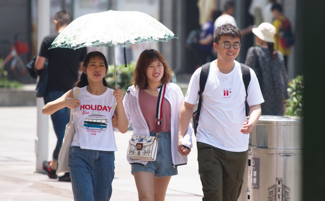 2019年7月29日,光谷广场上武汉血液中心的工作人员王甜甜、肖晶和付欢在等待无偿献血者。