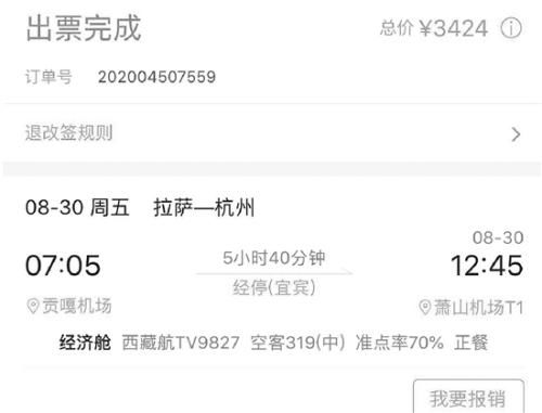 上周,刚结束西藏旅游行程的林女士,在去哪儿网上订了张8月30日西藏航空公司TV9827次航班、从拉萨飞杭州的经济舱机票,订单金额为3424元。
