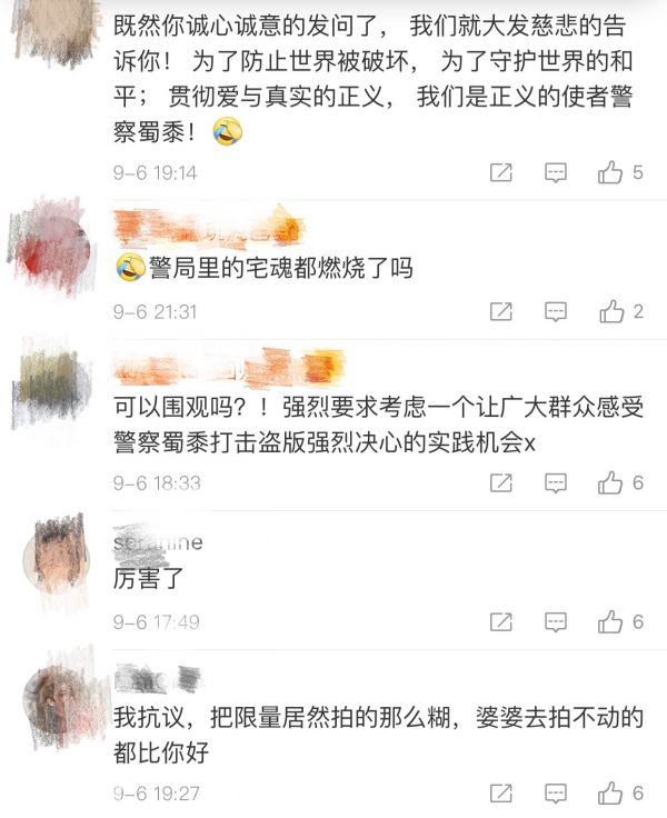 在这条警方发布的微博下,各“友局”也纷纷前来“吃柠檬”:有“江宁公安在线”请求组织全国巡回展出扩大学习交流,有“江苏网警”询问是否有转发抽奖活动,上海警方“傲娇”地表示只能考虑一下组织警营开放日。