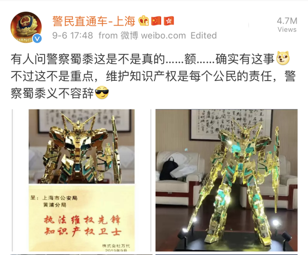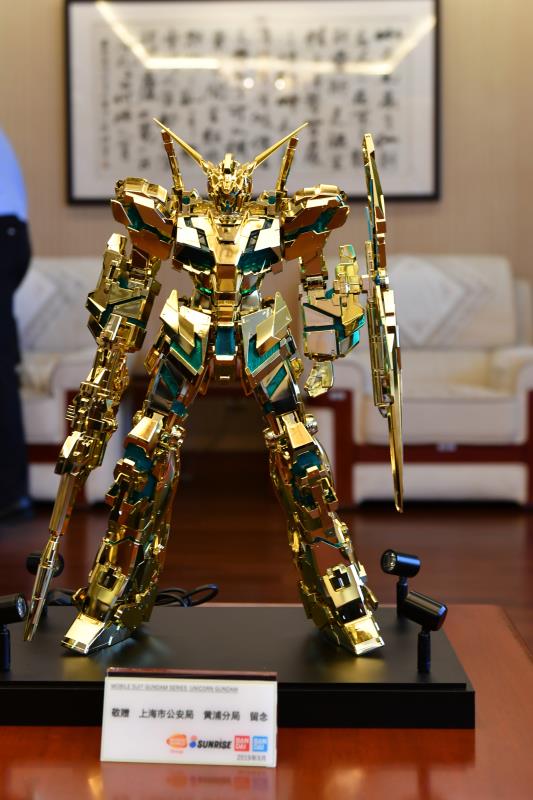 9月2日上午,万代公司带着这台全球限量“电镀金色觉醒PG独角兽”的高达模型来到了黄浦分局,他们是来致谢上海警方在今年8月一件侵权盗版手办案件中的努力。
