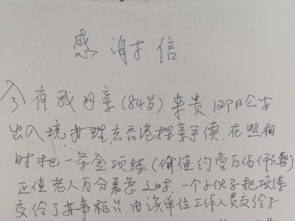 10月6日上午10时40分许,徐女士再次来到珞雄路警务室,当班民警余方敏通过查询得知捡袋乘客是扫码进站,继而与支付平台沟通,说明情况,与该乘客取得联系,对方承认并表示愿意归还项链,最后约定在光谷火车站归还。
