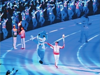 每场比赛间隙,可爱的兵兵就会上场与运动员、观众互动。