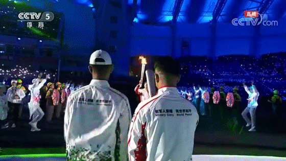 手捧“和平尊”的士兵,步入体育馆,标志着第七届世界军人运动会正式结束。