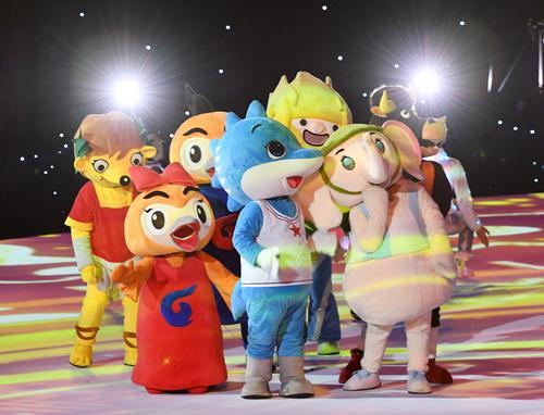 如闭幕式总导演杨笑阳所说:“此次闭幕式最大的亮点是将前六届军运会的吉祥物邀请到现场,和兵兵一起畅游、回忆和穿越。”闭幕式上,“兵兵”踏起光阴的涟漪,向世界军人运动会的源头回溯而行,历届军运会的吉祥物们也“穿越”到了现场。在韩国闻庆的花海里,演员手持扇子翩翩起舞,第六届军运会吉祥物Haeraon、Haeraoni兄妹来到现场;在巴西的绿茵场上,激情的桑巴点燃热情,“兵兵”与第五届军运会吉祥物ARION一起踢起了足球。武汉杂技团的10个小伙子搭起人梯,一段《草帽》表演热情洋溢。往届的吉祥物们集体登场,点亮本届军运会会徽“和平友谊飘带”上的七颗五角星,历史在此刻照进现实。