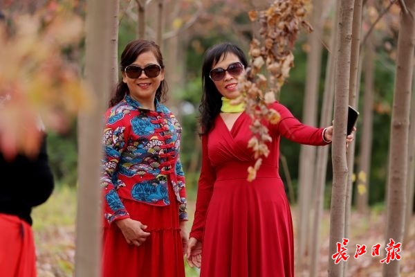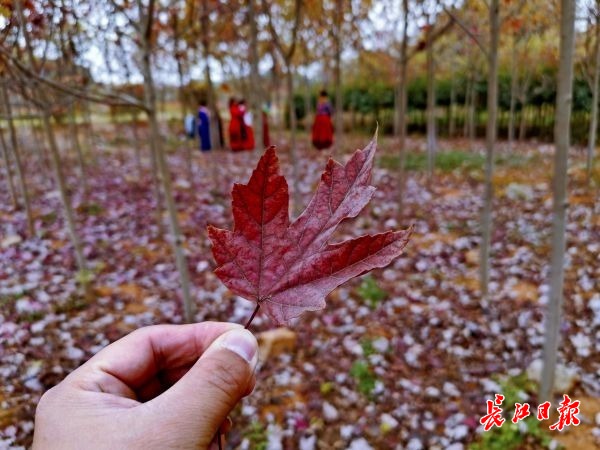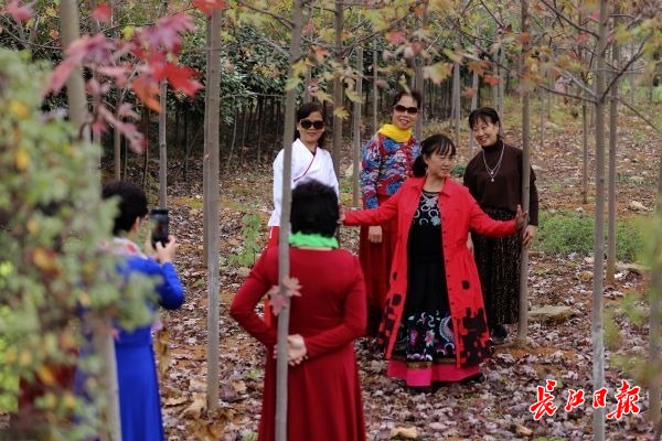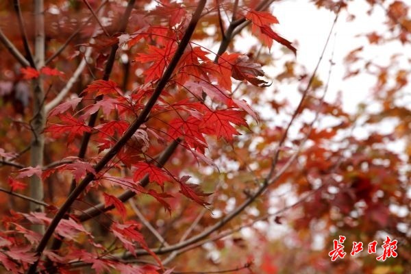 长江日报-长江网11月12日讯 2019年11月12日,武汉出现阴雨降温天气,不少市民相约来到华中农业大学校园里的枫叶林拍照,欣赏这里满地的红枫叶,体会“野色满园中,闲情立晚风, 菊花舍雨艳,枫叶醉霜红 ”的诗情画意。(记者杨涛 摄)