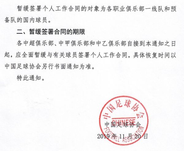 中国足协发布通知:各俱乐部暂缓签署国内球员工作合同