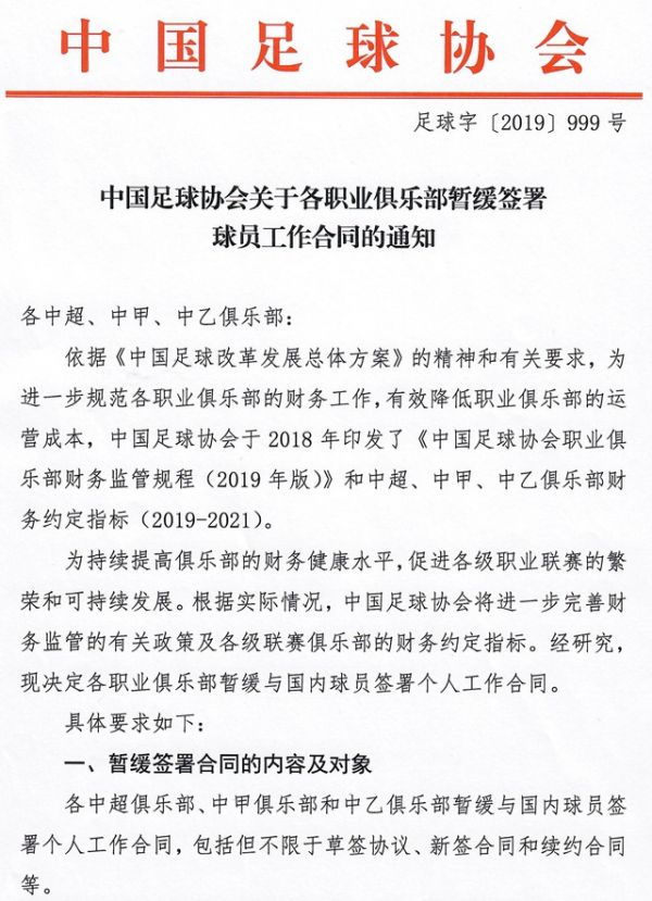 北京时间11月20日,中国足协官方发布通知,为持续提高俱乐部的财务健康水平,促进各级职业联赛的繁荣和可持续发展。各中超、中甲、中乙俱乐部暂缓与国内球员签署个人工作合同。
