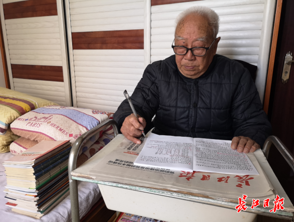 长江日报-长江网12月9日讯(记者覃柳玮 通讯员余俐霞)青山九旬退役军人孙日荣,坚持7年写下35本读报笔记。9日上午,长江日报-长江网记者一走进临江港湾小区孙日荣老人的家,就看见他正对着《长江日报》摘录当天的新闻。