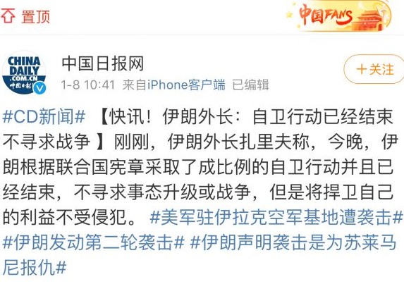 伊朗外长:自卫行动已经结束,不寻求战争