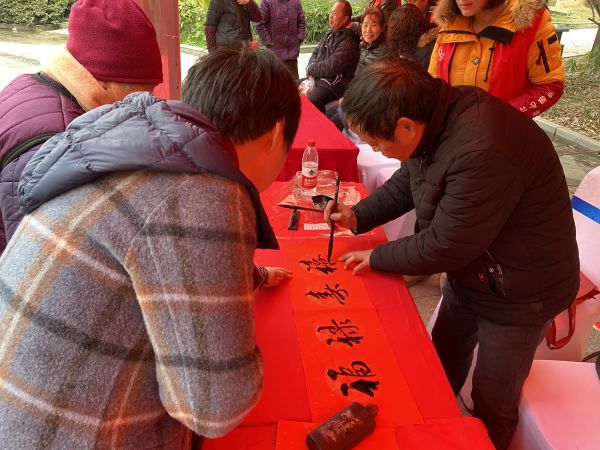 长江日报-长江网1月13日讯 13日,武汉市东湖高新区金地社区文化广场翰墨飘香,“金鼠迎春,写春联送祝福”活动吸引了众多居民围观。活动现场,书法家们义务为居民书写了近500幅新春对联,送上新年祝福,居民捧着喜庆吉祥的春联如获至宝、喜笑颜开。(记者高勇摄影报道)