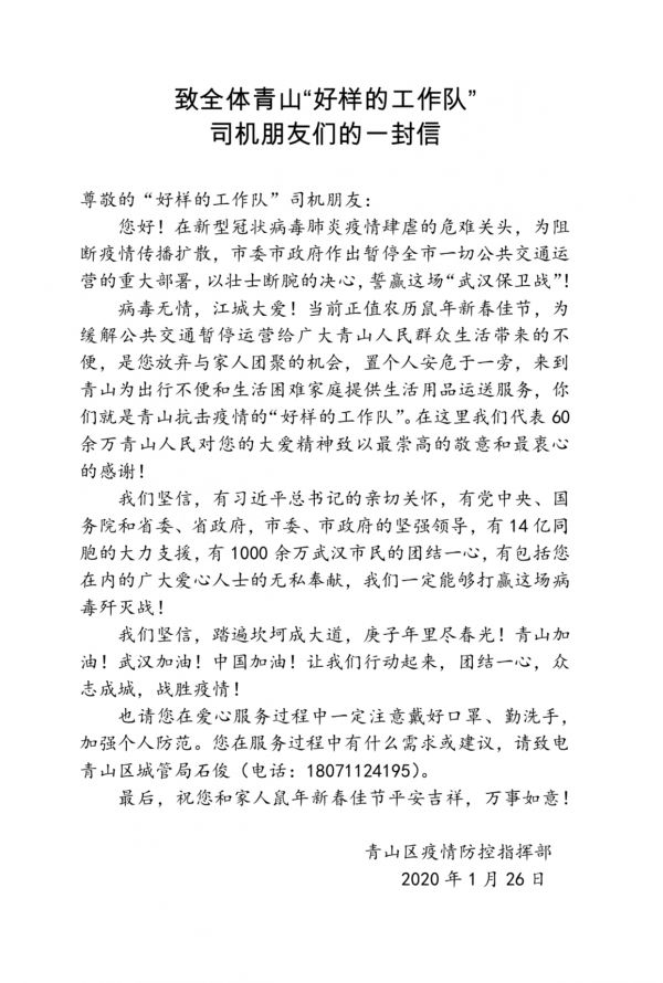 致全体青山“好样的工作队”司机朋友们的一封信 通讯员黄红波提供