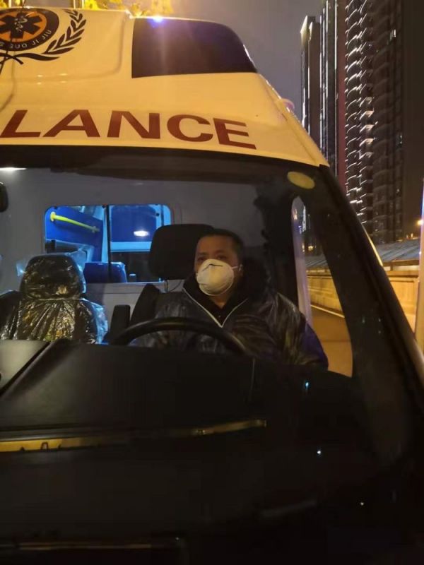 图:27日晚,城管司机甘哲平开急诊救护车转移病人(通讯员宋宏雷 提供)