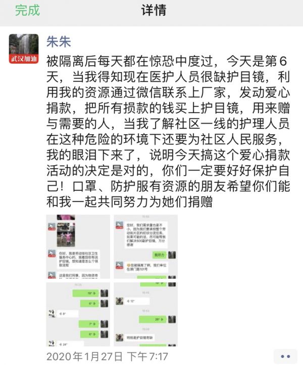 短短3天,她通过朋友圈筹集募捐资金1.7万元,从源头批发价采购近千副护目镜等抗疫防护用品,发到武汉。