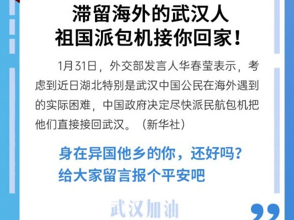 应外交部的要求,今天,民航局将派出两架民航加班航班,由厦门航空执飞,分别从泰国曼谷、马来西亚哥打基纳巴卢运送滞留在当地的武汉籍旅客返回武汉。