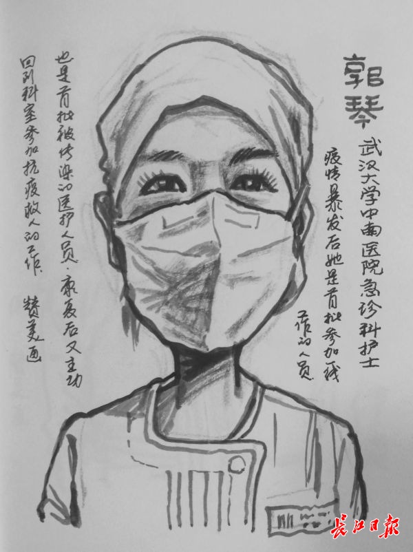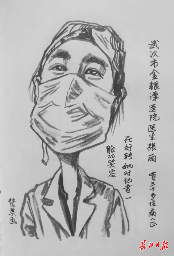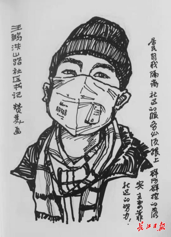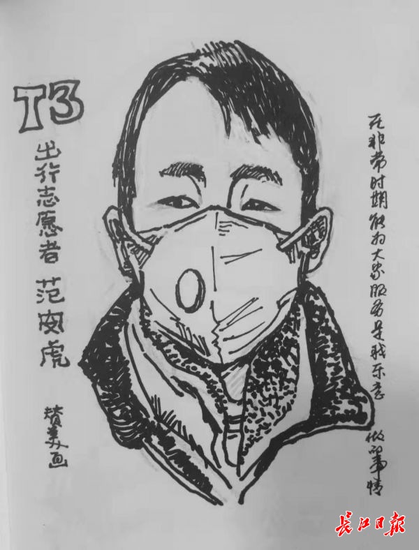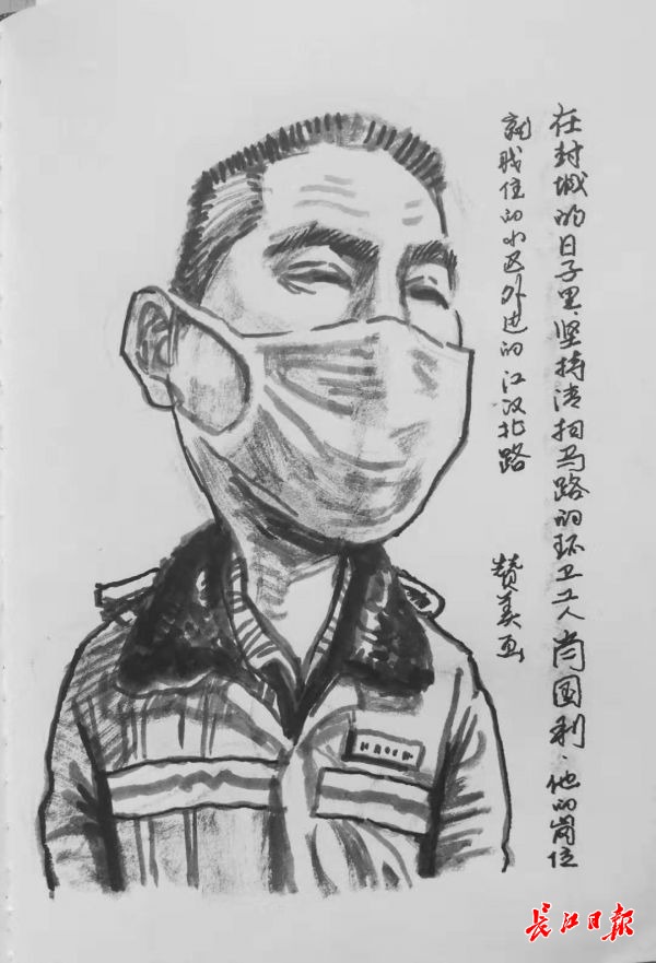 胡老师对记者说:“疫情爆发,哪个不怕传染呢?但没有他们及时清运垃圾,武汉的防疫不堪设想。”于是他用手机给这个环卫工拍了一张照,上楼回家就在速写本上作画。这位从事肖像和民俗漫画创作40多年的武汉漫画研究会副会长,想用他的画笔,“来画这些不起眼的人,汇成一个《抗疫无名英雄录》,让人记住这些平凡而为城市默默奉献的人。”胡赞美说。