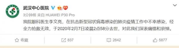 获悉武汉市中心医院眼科医生李文亮在抗击疫情中不幸感染新冠肺炎,经全力抢救无效不幸去世。省卫生健康委向李文亮医生表示深切哀悼,并向其家属表示诚挚慰问!向一直奋战在抗疫一线的全体医务工作者表示崇高敬意!值此抗疫关键时期,希望全体医务人员在抗击疫情的战斗中切实做好个人防护,更好地为人民群众健康服务,坚定信心、齐心协力打赢这场防疫阻击战!