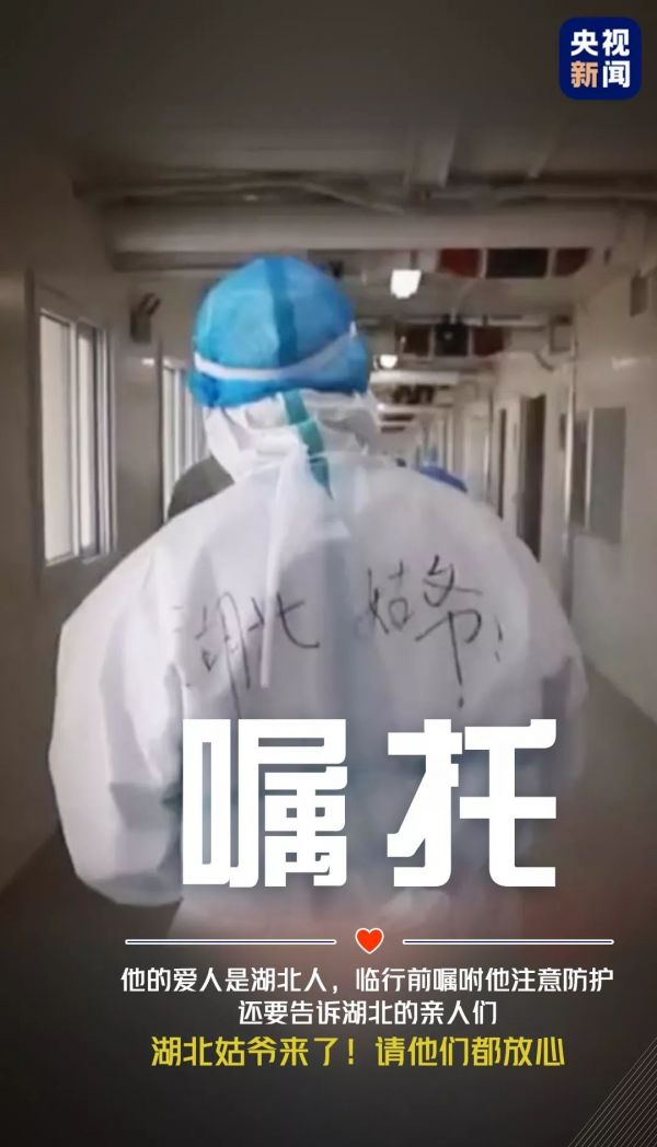 他的防护服上写着“湖北姑爷”,原来他的爱人是湖北人,临行前嘱咐他注意防护,还要告诉所有的湖北亲人们:姑爷来了,请他们都放心。