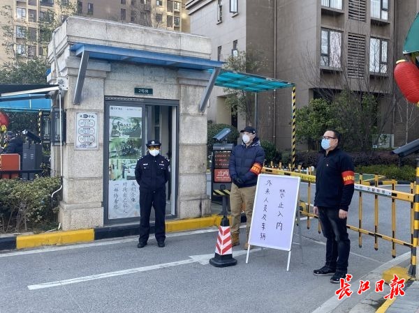长江日报-长江网2月18日讯(记者陶可祎 通讯员任理华)18日下午2点,洪山区保利心语9区2号门前,社区书记李人杰戴着红袖章,正在值守。长江日报-长江网记者看到,右侧的人行入口已封闭,只留下左侧的人行出口,车行出入口前有栏杆隔挡,还竖着一块白色警示牌,写着“外来人员及车辆禁止入内”。