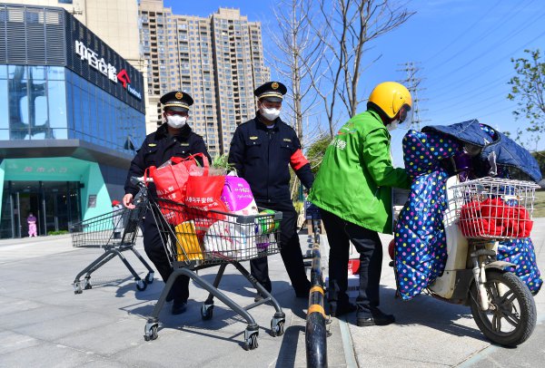 自从社区实行24小时封闭后,为了保证居民生活必需品的供应,江汉区公安分局开发所的民警们成为了居民们的“跑腿代购”“外卖小哥”。