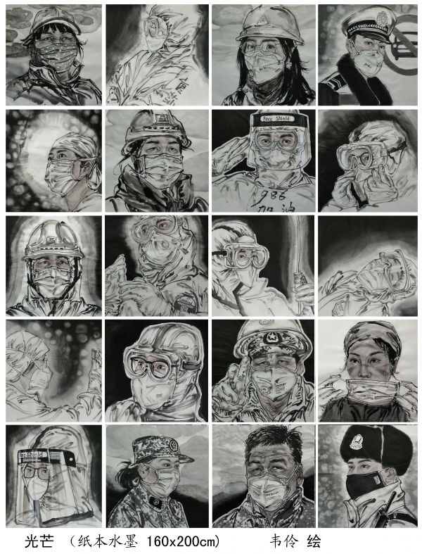 韦伶在义卖捐赠的同时,积极绘制战“疫”作品,讴歌平凡英雄。她绘制的国画作品《光芒》,共描绘了20名战斗在一线的平凡人物,他们中有医护人员、军人、警察、街道社区工作者、志愿者和雷神山、火神山医院的建设者等等。韦伶说:“是这些平凡的英雄为我们撑起了安全的天空,我们应当赞美他们,为他们留下影像。”