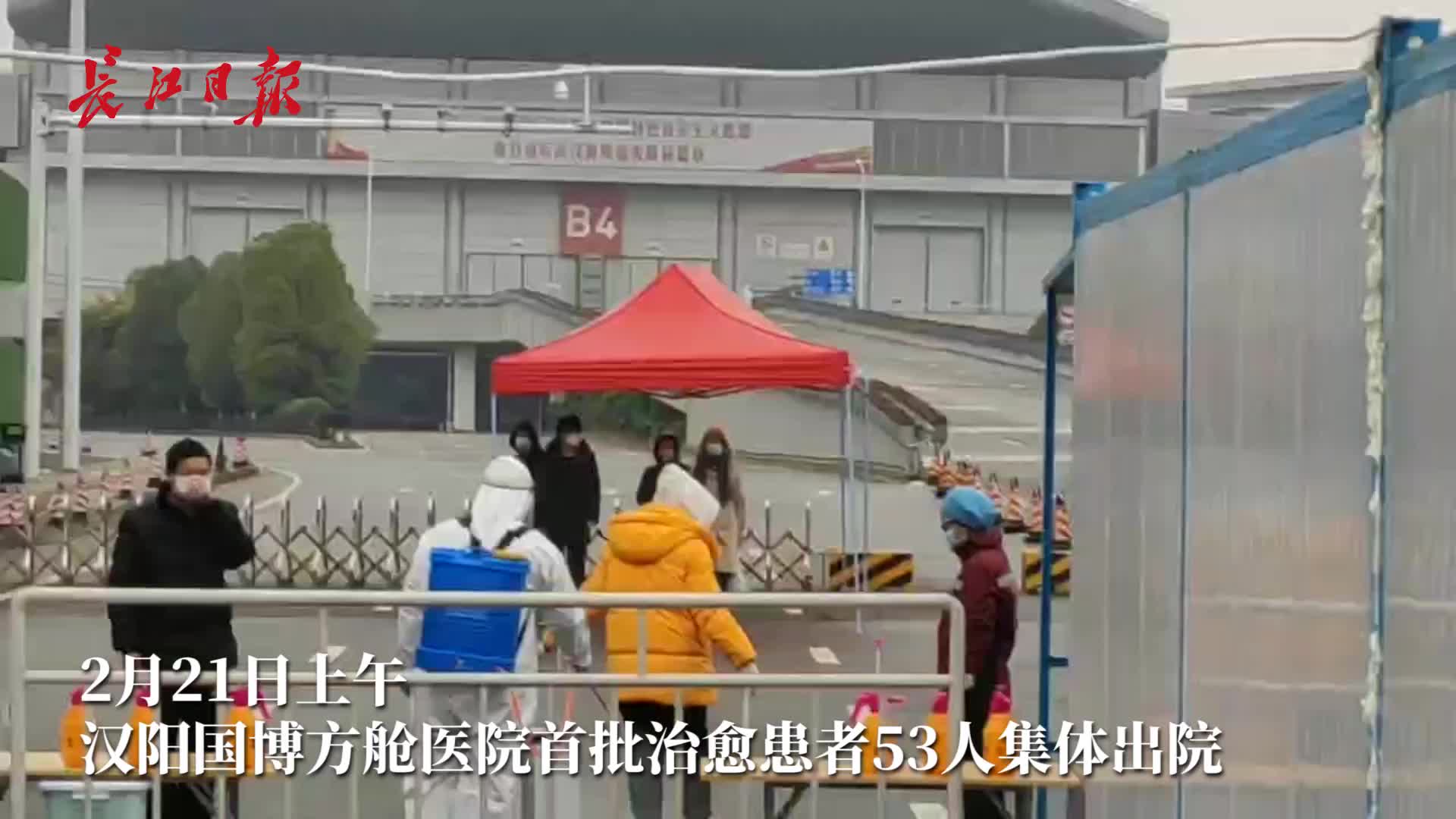 2月26日,何淦(右一)参与转运江汉方舱医院的治愈患者 本人提供