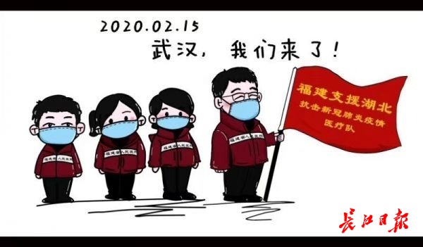 2月15日医疗队出征后,喜爱画漫画的曾妍,画了一组只有2幅的漫画,一幅是领队陈捷举着队旗;一幅是医疗队到达武汉,上面写着:“武汉,我们来了!”