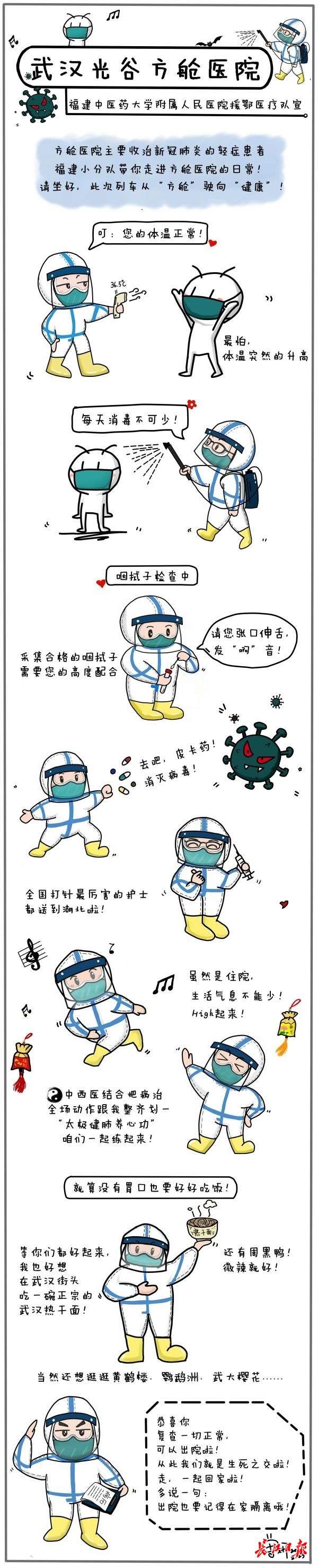 长江日报-长江网3月4日讯(记者明眺生)福州市一名80后女医生先后画了3组、共20幅战“疫”题材的漫画,为福建驰援光谷方舱医院医疗队的队员们加油、打气。有趣的是,虽然没有来过武汉,漫画中却融入了黄鹤楼、鹦鹉洲、武大樱花、热干面、周黑鸭等武汉元素。