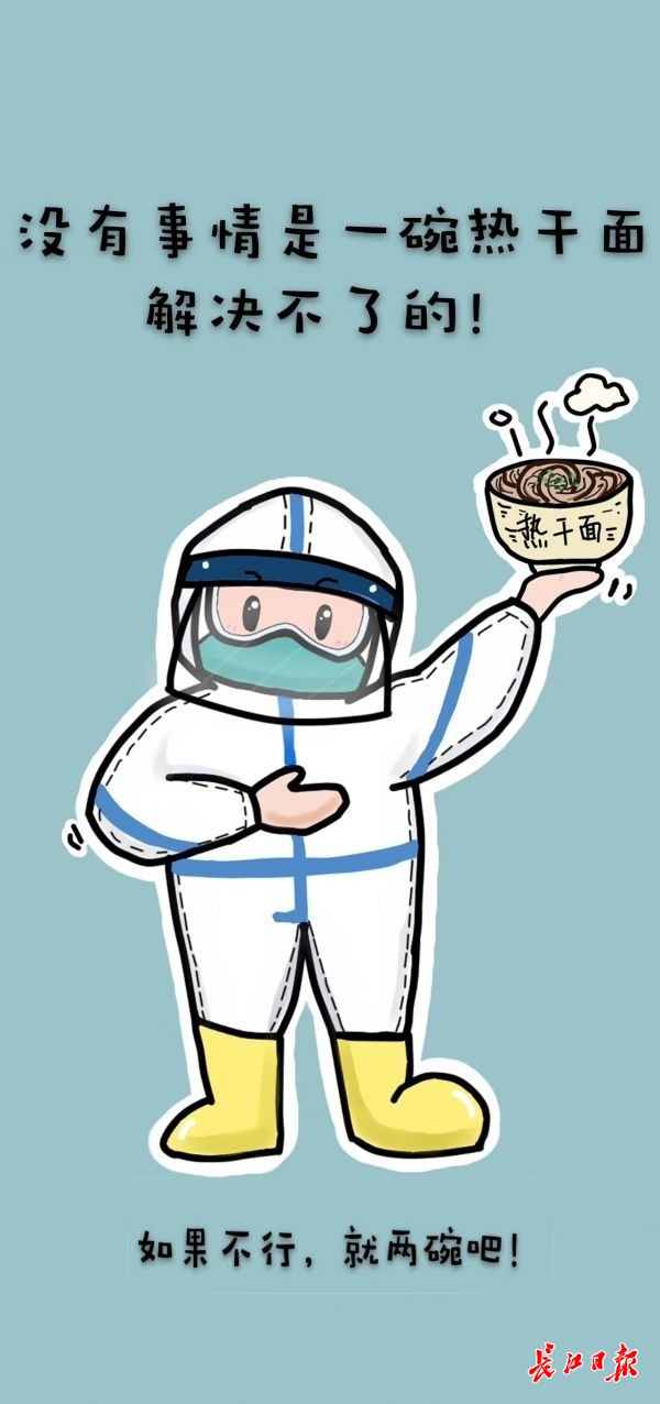 2月23日,曾妍又画了9幅漫画,发在自己的朋友圈。她写道:“送给援鄂的医生护士们,辛苦啦!”其中一幅融入了武汉美食热干面,配文:“没有事情是一碗热干面解决不了的!”“如果不行,就两碗吧!”