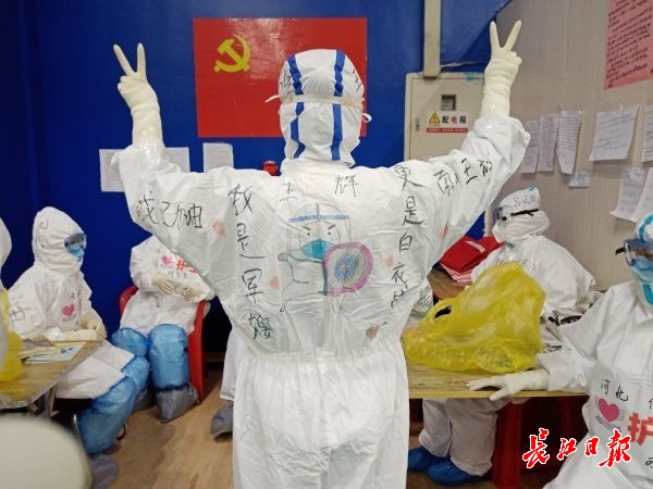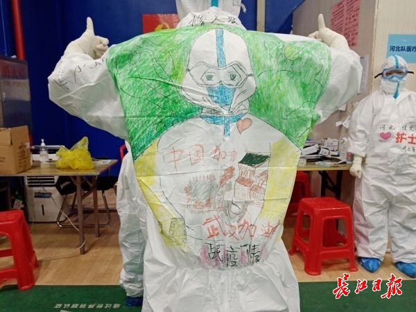 长江日报-长江网3月9日讯(记者周满珍 通讯员柯健)“战疫情,武汉加油!”“热干面加油!”3月8日,汉阳体校方舱休舱,河北医疗队的10位医护人员,提前把祝福的话语,画在防护服上,送别最后一批患者。