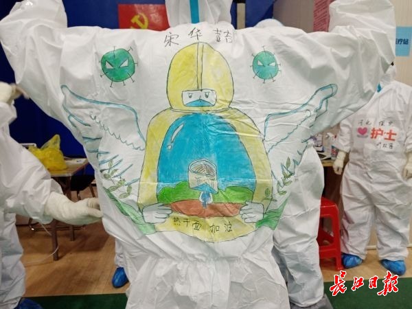 她告诉长江日报-长江网记者,当天适逢三八妇女节,医疗队想为病患制造特别的惊喜,便根据网上的创意,在防护服上作画。“说实话,工作以后就没画了,手生,画得比较慢。方舱为我们准备的是蓝色的隔离衣,不好上色,好在我们医疗队自带的隔离衣是白色的,医用标准一样。”宋华喆负责创意和整体构图,其他小伙伴负责填色,写字,赶在凌晨三点上班前,完成了创作。