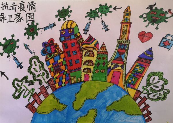 小作者说:这幅画的主题是加油武汉,每个人为抗击疫情呐喊,每个人站在自己的“小船”上,互相不拥挤,不聚集,每个人为抗击疫情贡献自己的一份力,上面有小鱼、星星、帆……代表着每个人内心最明亮的想法,相信我们的祖国会越来越好。