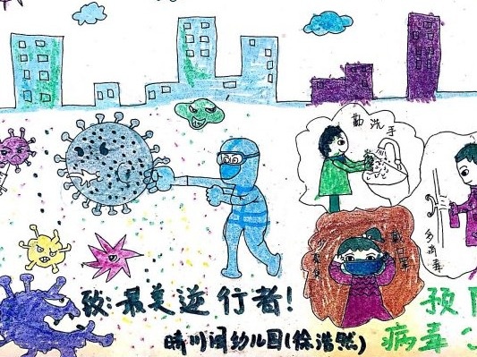 小作者说:画的左边是专家们正在研究消灭病毒的药剂,医护人员不断将病历和病人的情况报告给专家。他们把药剂研制出来了,将药剂放进科学的宝葫芦里面,将所有的病毒都收了进去,病毒举着白旗投降了,我们取得了胜利。
