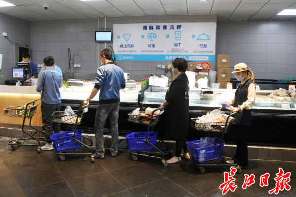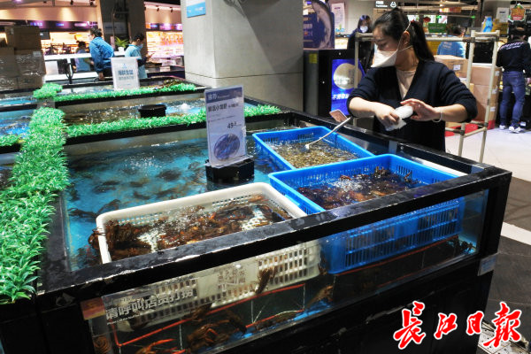 长江日报-长江网3月25日讯 3月25日,在汉口青年路一家超市里,居民凭健康码并测量体温后有序进入超市购物。超市里各种商品一应俱全,长江日报-长江网记者在水产区看到,刚刚上市的小龙虾也吸引了不少市民购买,超市联系的直供货源让人们在疫情期间也可以购买到小龙虾、扇贝、花甲等各种鲜活水产品。(记者詹松 摄影报道)