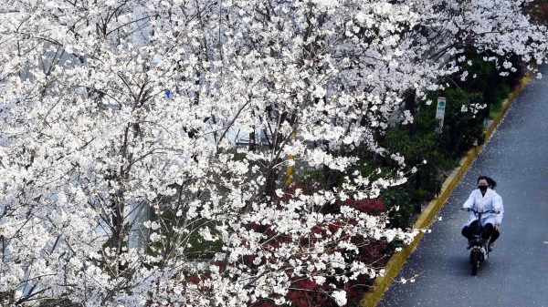 3月中旬,武汉的确诊病人已经减少到个位数,大家的心情都敞亮起来。有天,我下楼拿快递,一眼看见那棵樱花不知什么时候已经开了。那粉白的单瓣樱花开得密匝匝的,真的像一团霞雾。樱花终于开了,我的心情立刻大爽,我们离胜利不远了。