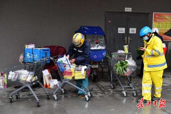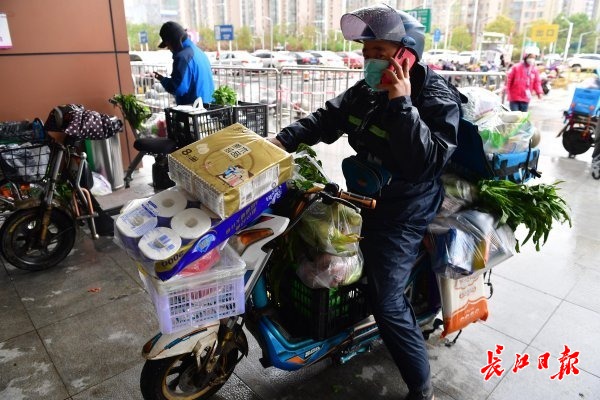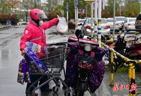 长江日报-长江网3月29日讯 3月29日,金银潭一大型超市门口,10多位外卖“小哥”骑着电动车来回奔忙。从超市里推出一辆辆满载的购物小车,将物品搬上电瓶车,随即匆匆上路。据了解,该超市“到家”业务起送购物金额下调到49元。近日降温降雨,订单量大增。