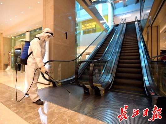 长江日报-长江网3月29日讯 29日下午,武商广场大楼持续消毒,为30日的恢复营业做准备。据悉,武商广场营业时间为10:00-17:00,入口处均设立体温检测点,无疫情小区居民持健康码“绿码”扫码登记,测量体温正常、佩戴口罩方可进入。(记者彭年 摄影报道)